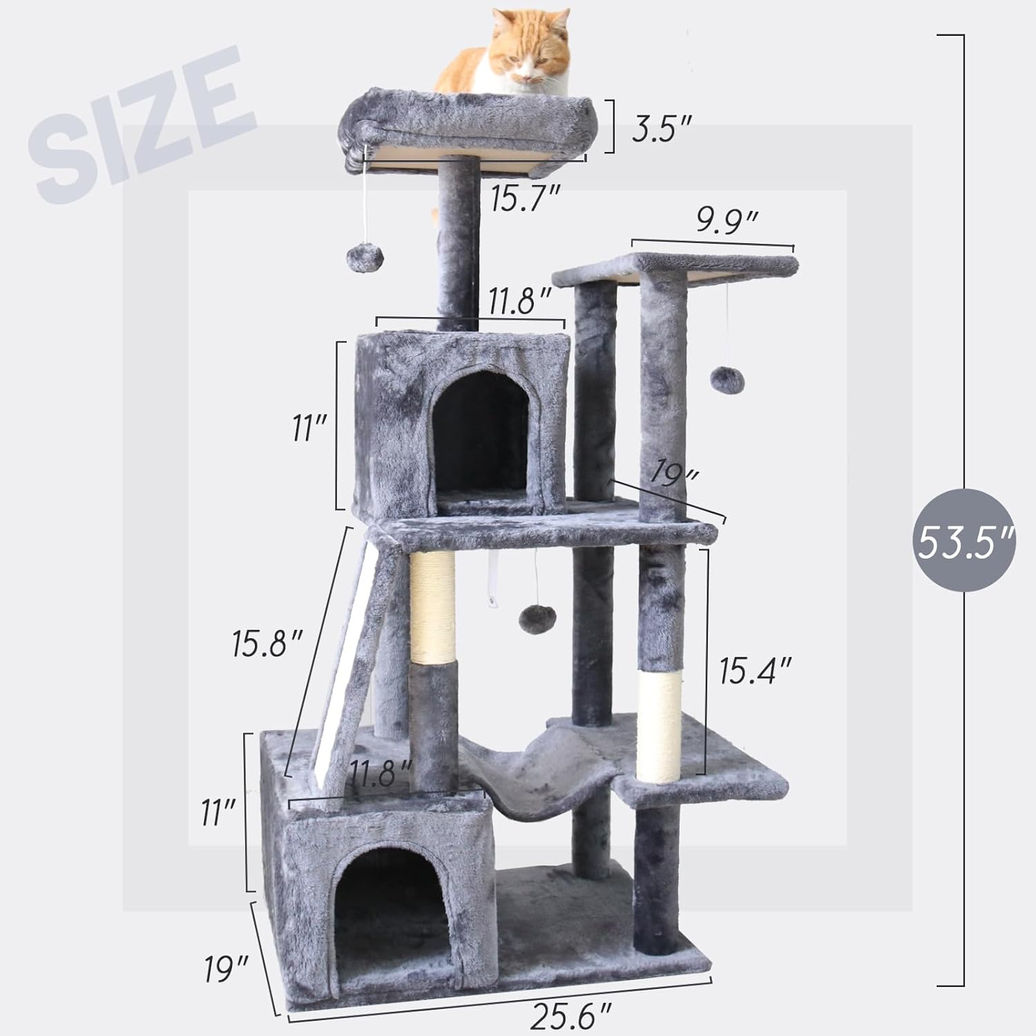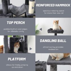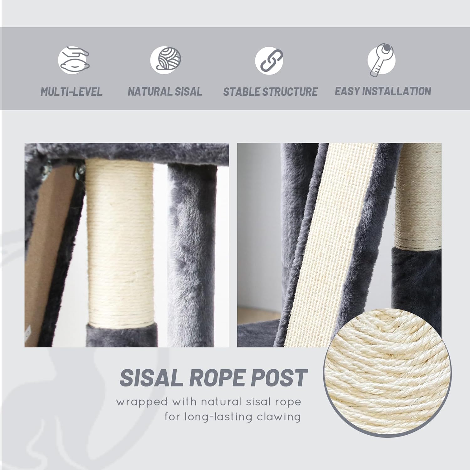 מתקן גירוד רב-תכליתי לחתולים עם ארבע קומות הכוללות בית, ערסל ופלטפורמות קפיצה. כולל עמודי סיסל טבעיים לגירוד, מבנה יציב ובד רך למקסימום נוחות. עיצוב מודרני שמתאים לכל חלל והרכבה פשוטה עם כל החלקים כלולים.